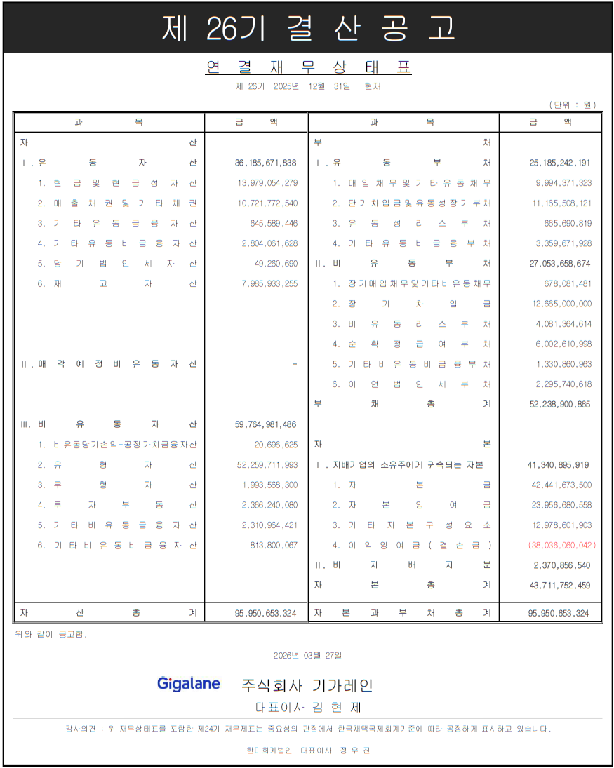 제26기 기가레인 결산공고 연결기준