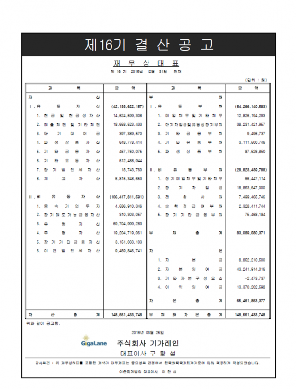 (주)기가레인 2015년 결산 공고(별도기준) 페이지 정보 작성자 최고관리자 작성일16-03-25 10:42 조회14,916회 댓글0건 관련링크 이전글 다음글 목록 본문 (주)기가레인 2015년 결산 공고(별도기준) 입니다. 댓글목록 등록된 댓글이 없습니다. 이전글 다음글 목록