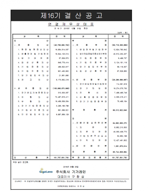 (주)기가레인 2015년 결산 공고(연결기준) 페이지 정보 작성자 최고관리자 작성일16-03-25 10:47 조회15,799회 댓글0건 관련링크 이전글 다음글 목록 본문 (주)기가레인 2015년 결산 공고(연결기준) 입니다. 댓글목록 등록된 댓글이 없습니다. 이전글 다음글 목록