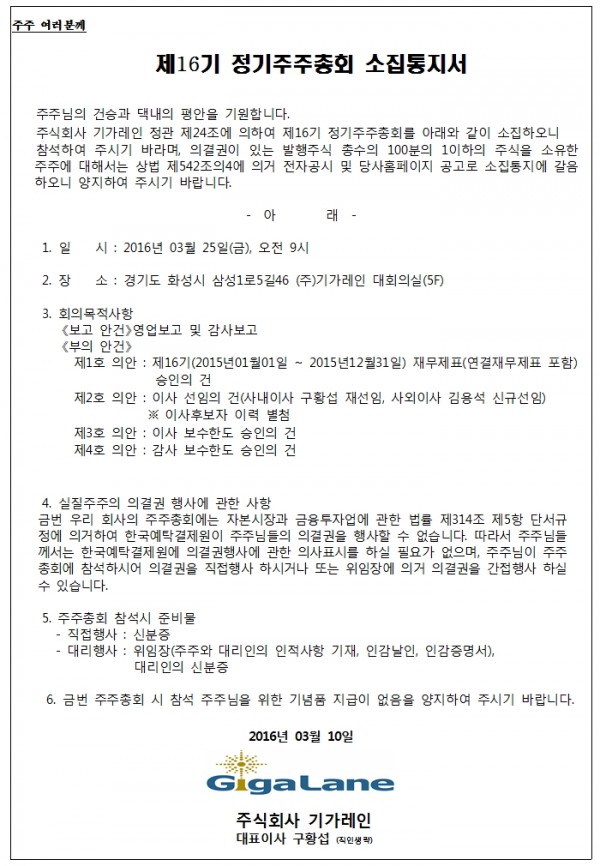 제 16기 정기주주총회를 소집합니다.