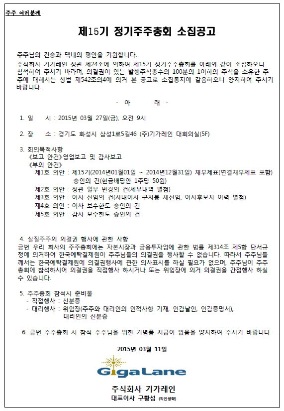 제 15기 정기주주총회 소집통지 페이지 정보 작성자 최고관리자 작성일16-03-18 09:48 조회89,183회 댓글0건 관련링크 이전글 목록 본문 기가레인 제 15기 정기주주총회 소집을 통지합니다. 댓글목록 등록된 댓글이 없습니다. 이전글 목록