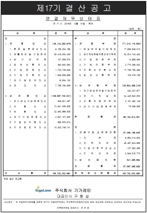 (주)기가레인 2016년 결산 공고(연결기준) 페이지 정보 작성자 최고관리자 작성일17-03-31 11:01 조회179,883회 댓글0건 관련링크 이전글 다음글 목록 본문 (주)기가레인 2016년 결산 공고(연결기준) 입니다. 댓글목록 등록된 댓글이 없습니다. 이전글 다음글 목록