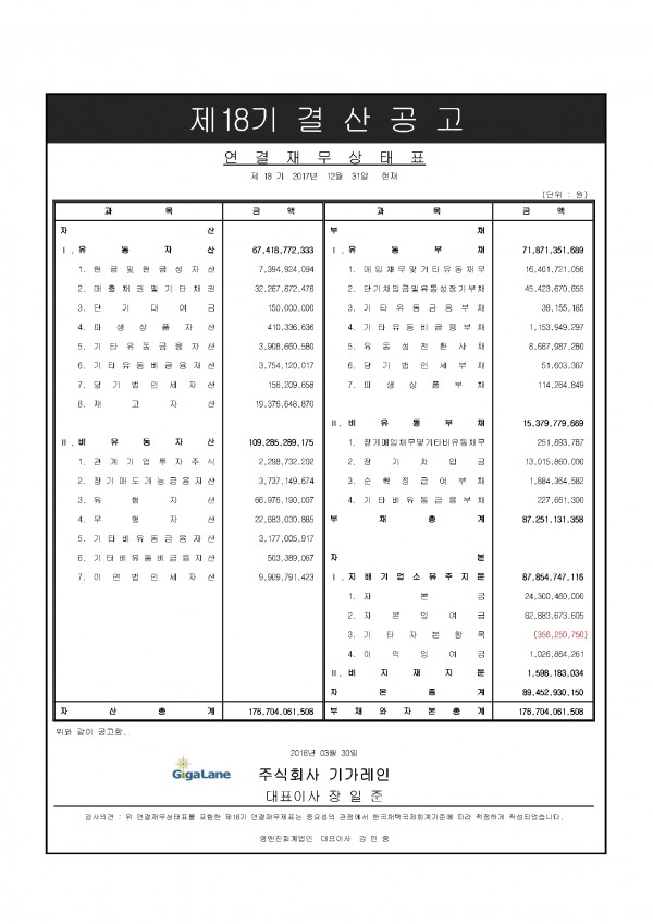 (주)기가레인 2017년 결산 공고(연결기준) 페이지 정보 작성자 최고관리자 작성일18-03-30 14:47 조회23,448회 댓글0건 관련링크 이전글 다음글 목록 본문 (주)기가레인 2017년 결산 공고(연결기준) 입니다. 댓글목록 등록된 댓글이 없습니다. 이전글 다음글 목록